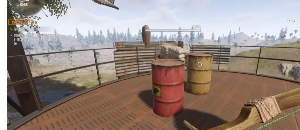 玩家在到了大铁球这个位置以后,会看到大铁球的旁边有两个巨大的桶,桶的方便还是楼梯,顺着楼梯一直走到桶的上面可以看到有2个红色的桶,用弓箭直接把红桶给射碎能够收获到劣质的原油,在其中的一处拿到原油以后,玩家可以在四周都探索一下把原油全都收集起来,找一找有没有炼油机给原油加工一下。