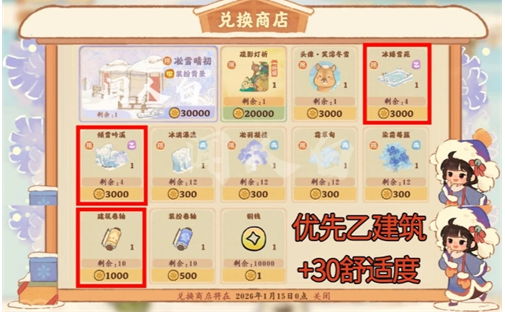 桃源深处有人家淞雪兆吉兑换商店兑换推荐,「淞雪兆吉」活动开启,商店中限量背景与外观建议0氪玩家二选一;乙、丙级建筑至少各换一个以收集图鉴,新甲级卷轴同样推荐优先兑换。头像类物品可根据喜好选择。