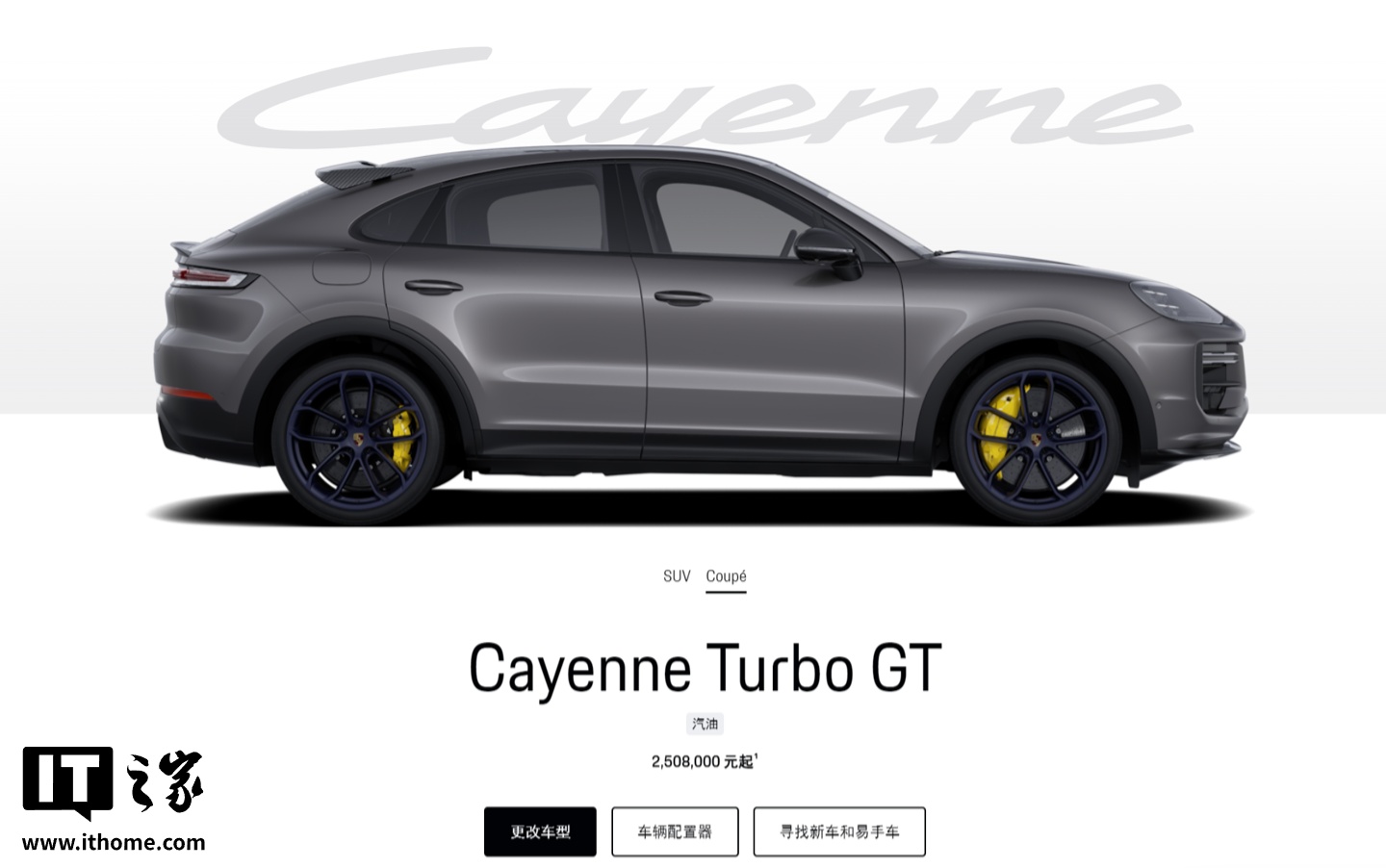 查询保时捷中国官网,保时捷卡宴 Turbo GT 国内的售价为 250.8 万元起,零百加速 3.3s,最高速可达 305km/h。目前尚不清楚这个定制版有何特别功能。