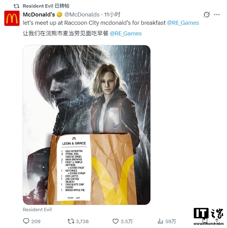 生化危机官方 X 账号帖子显示,该游戏不仅和保时捷合作,还有麦当劳、英伟达显卡合作。