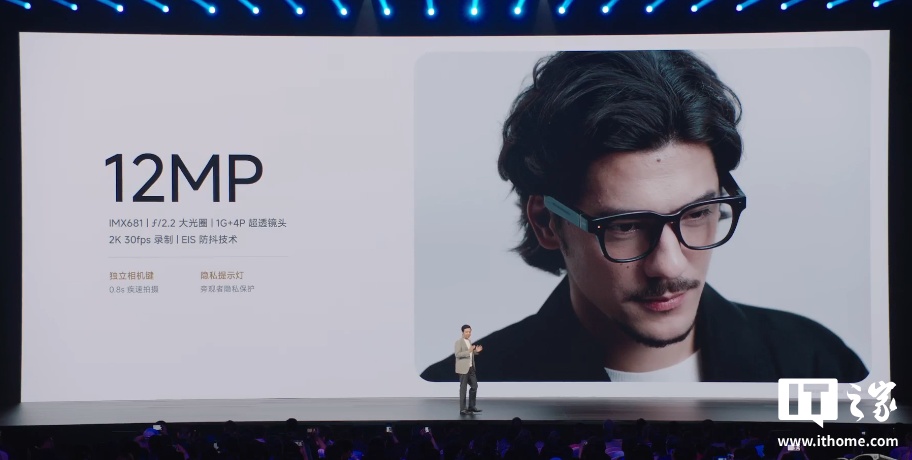 该眼镜支持第一人称相机,搭载 12MP 镜头,可用于录制视频,搭配第三方 App 可视频通话、视频直播。