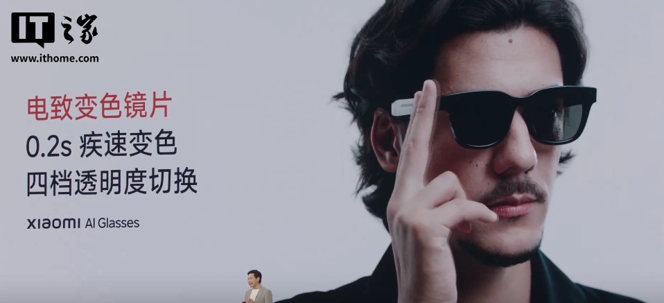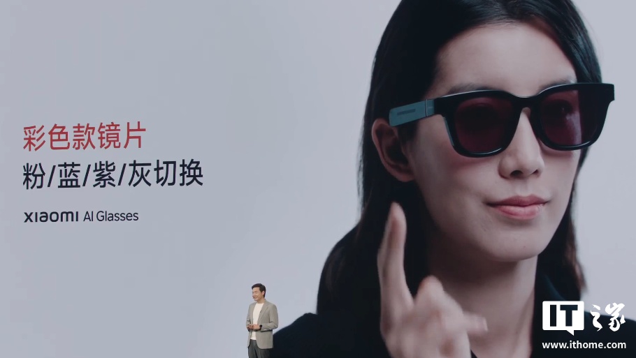 小米 AI 眼镜可选电致变色镜片、彩色镜片版本,双指在镜框划两下即可变色。