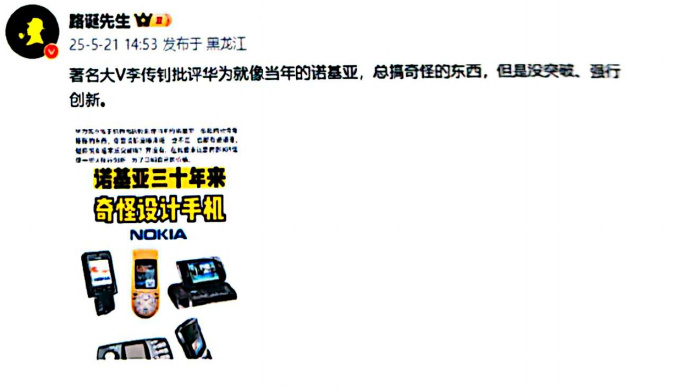 违规言论:著名大 V 批评某品牌就像当年的诺基亚,总搞奇怪的东西,但是没突破、强行创新。