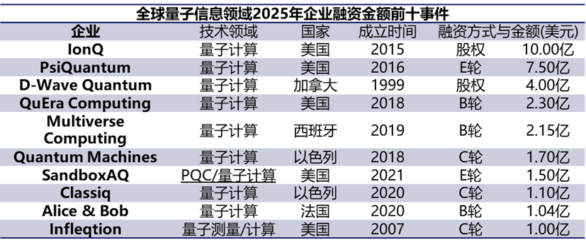 3. 2025 年量子信息领域市场投融资热度高涨。近十年,全球量子信息领域产业投融资事件达 1400 余笔,融资金融超 145 亿美元,其中风险投资占比约 67%。今年量子计算明星企业成为资本市场的追捧热点,欧美量子企业在前十融资事件中占据 8 席,另外 2 家以色列量子计算企业和欧美生态系统联系紧密。