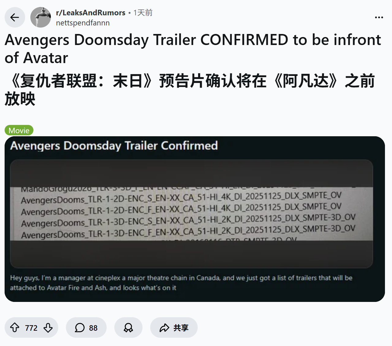 此次爆料的依据主要来自一张内部排期截图,据称由加拿大 Cineplex 影院经理提供。该截图清晰地列出了名为“AvengersDooms_TLR-1”的文件条目,涵盖 2D 和 3D 两种格式,日期标注为 11 月下旬,目前的线索与早先关于“一支约 85 秒的预告片将随年底大片发布”的传闻高度吻合。