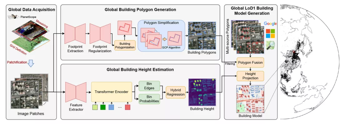 研究人员首先利用来自欧洲、北美和大洋洲 168 个城市的参考数据对系统进行了训练,随后,研究团队向该工具输入了约 80 万张 2019 年拍摄的卫星图像,要求算法预测每一栋建筑的高度、体积和占地面积。“全球建筑图谱”的空间分辨率达到 3 米 ×3 米,并可定期利用新数据进行更新。