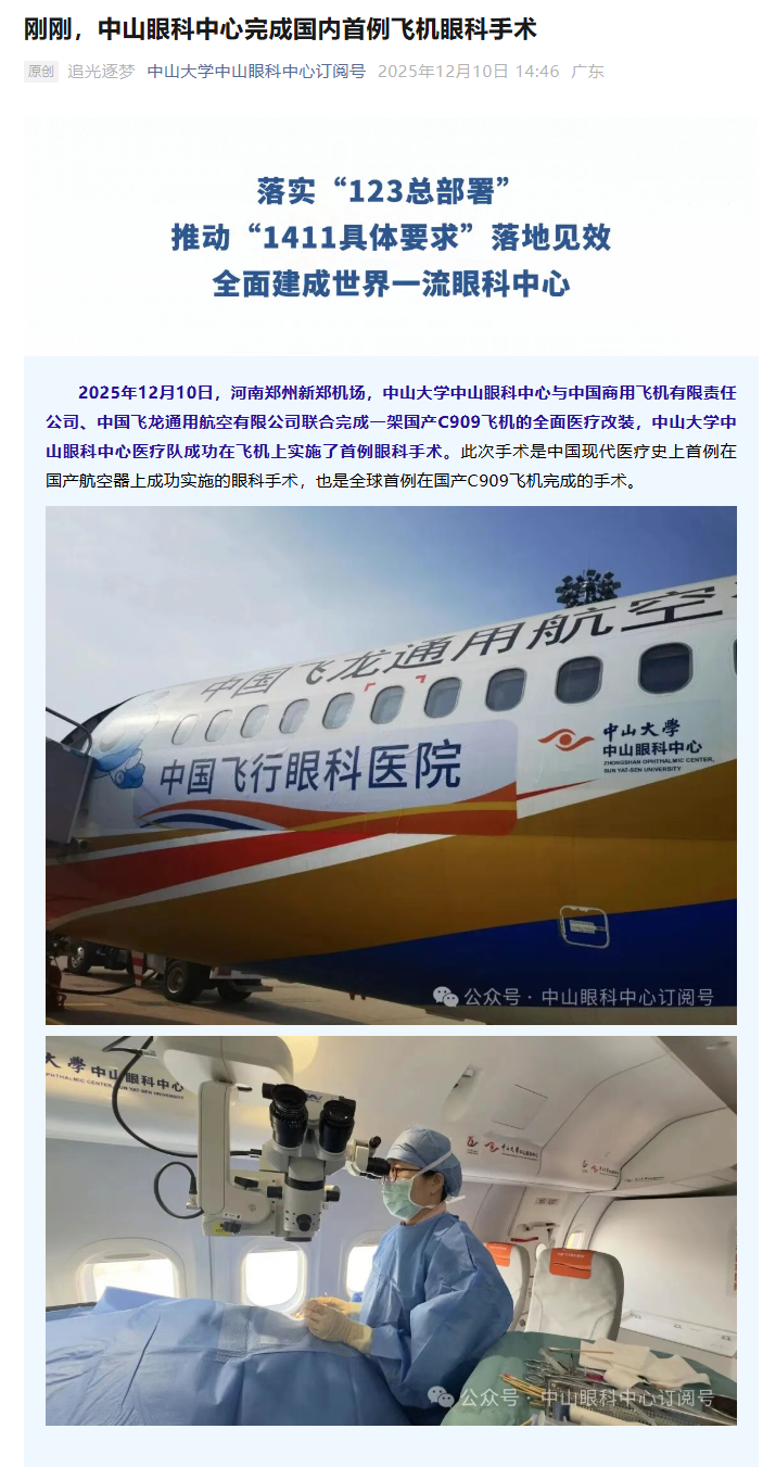 12 月 14 日消息,据中山大学中山眼科中心官方,12 月 10 日,在河南郑州新郑机场,中山大学中山眼科中心与中国商用飞机有限责任公司、中国飞龙通用航空有限公司联合完成一架国产 C909 飞机的全面医疗改装,中山大学中山眼科中心医疗队成功在飞机上实施了首例眼科手术。