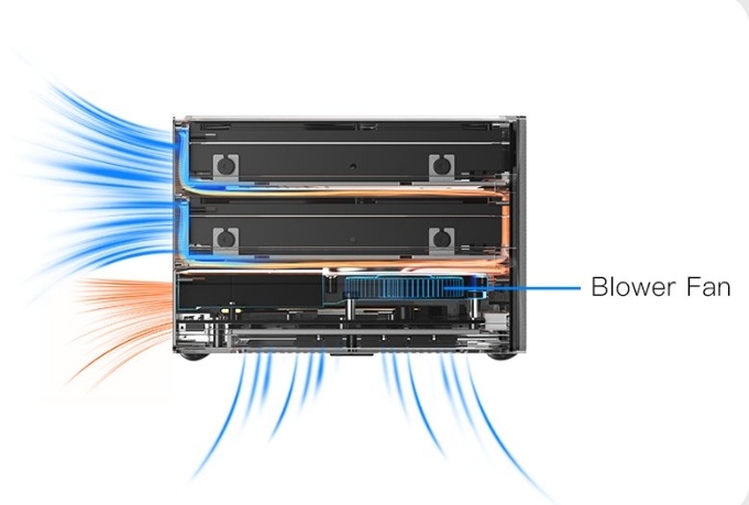 对于双盘位机型,机械硬盘通过导热垫连接到金属托盘,下方小风扇带动气流可以同时给主板和机械硬盘进行散热,从而将整机压缩至 2.25L(注:飞牛 Evo 2 约为 2.33L)。