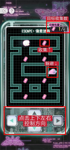 迷阵小游戏:躲避会动的爬虫、点击上下左右收集对应数量的电量后即可获胜。