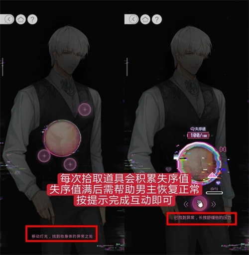 每次拾取道具会积累失序值,失序值满后需帮助男主恢复正常。