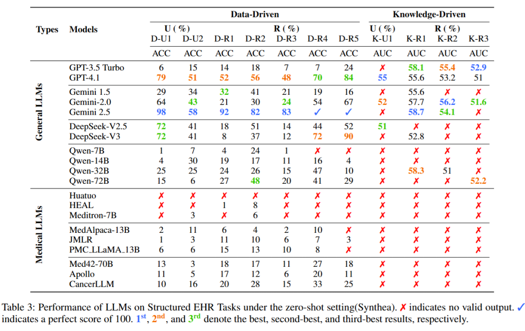 其中,以 Gemini 系列为代表的闭源商业模型整体排名领先,展现出对结构化 EHR 任务更强的泛化能力。