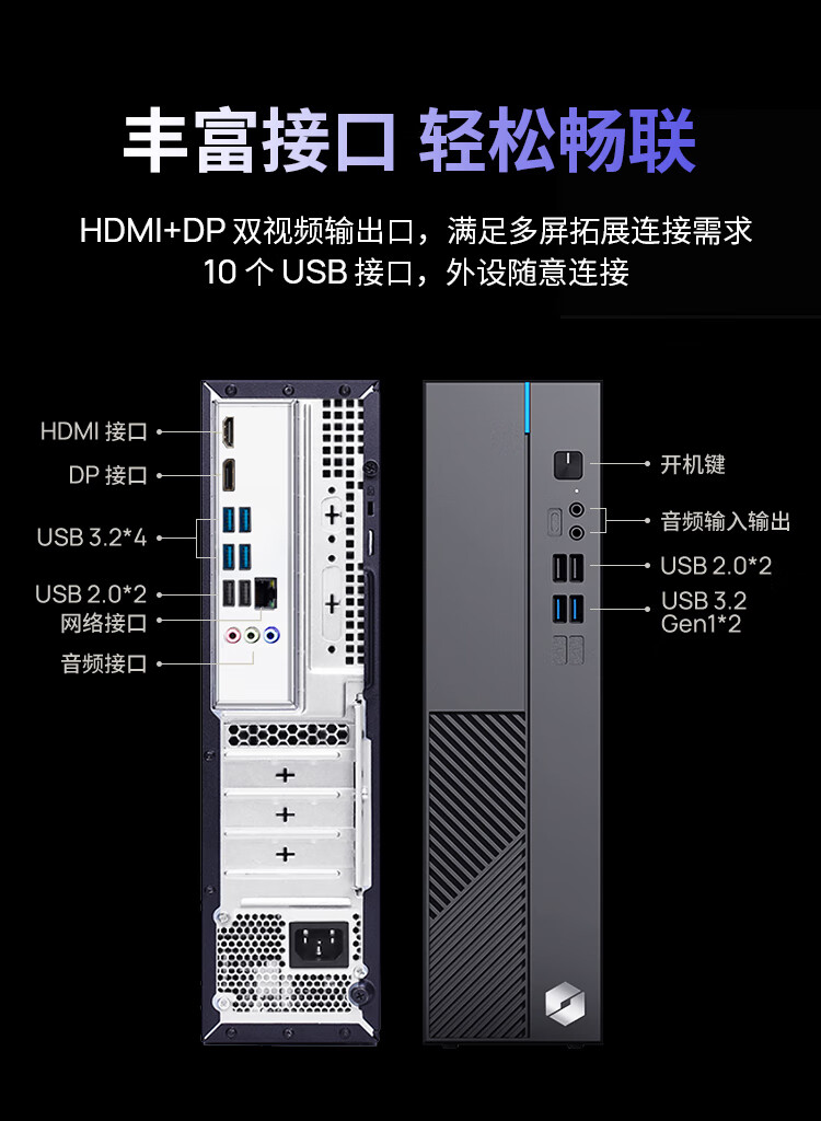 其内置了 200W 电源,外接设备即插即用;连接上支持 Wi-Fi 6 和蓝牙 5.2,配有 HDMI+DP 双视频输出口以及 10 个 USB 接口。同时,这款主机还预装了正版 Windows 11。