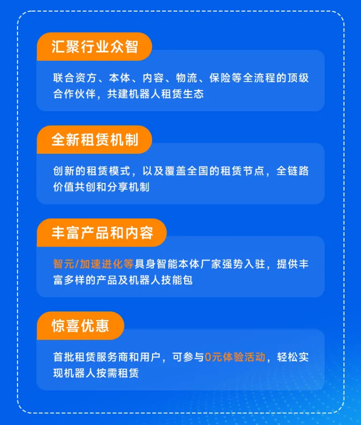 从邀请函介绍获悉,智元将打造“全新租赁机制”,租赁节点覆盖全国,智元、加速进化等机器人厂商入驻平台,首批租赁服务商和用户可参与 0 元体验活动。