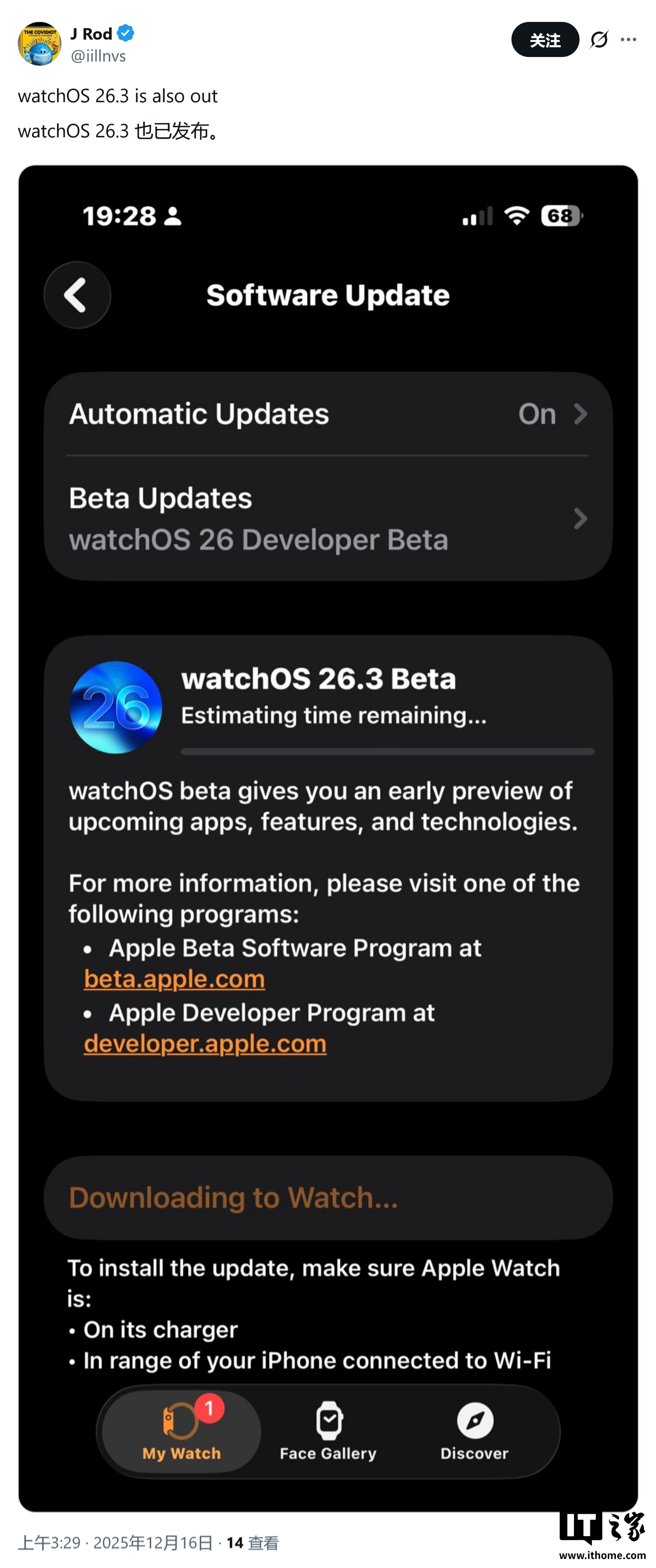 12 月 16 日消息,苹果今日向 Apple Watch 用户推送了 watchOS 26.3 开发者预览版 Beta 更新(内部版本号:23S5586d),本次更新距离上次发布 Beta / RC 间隔 12 天。