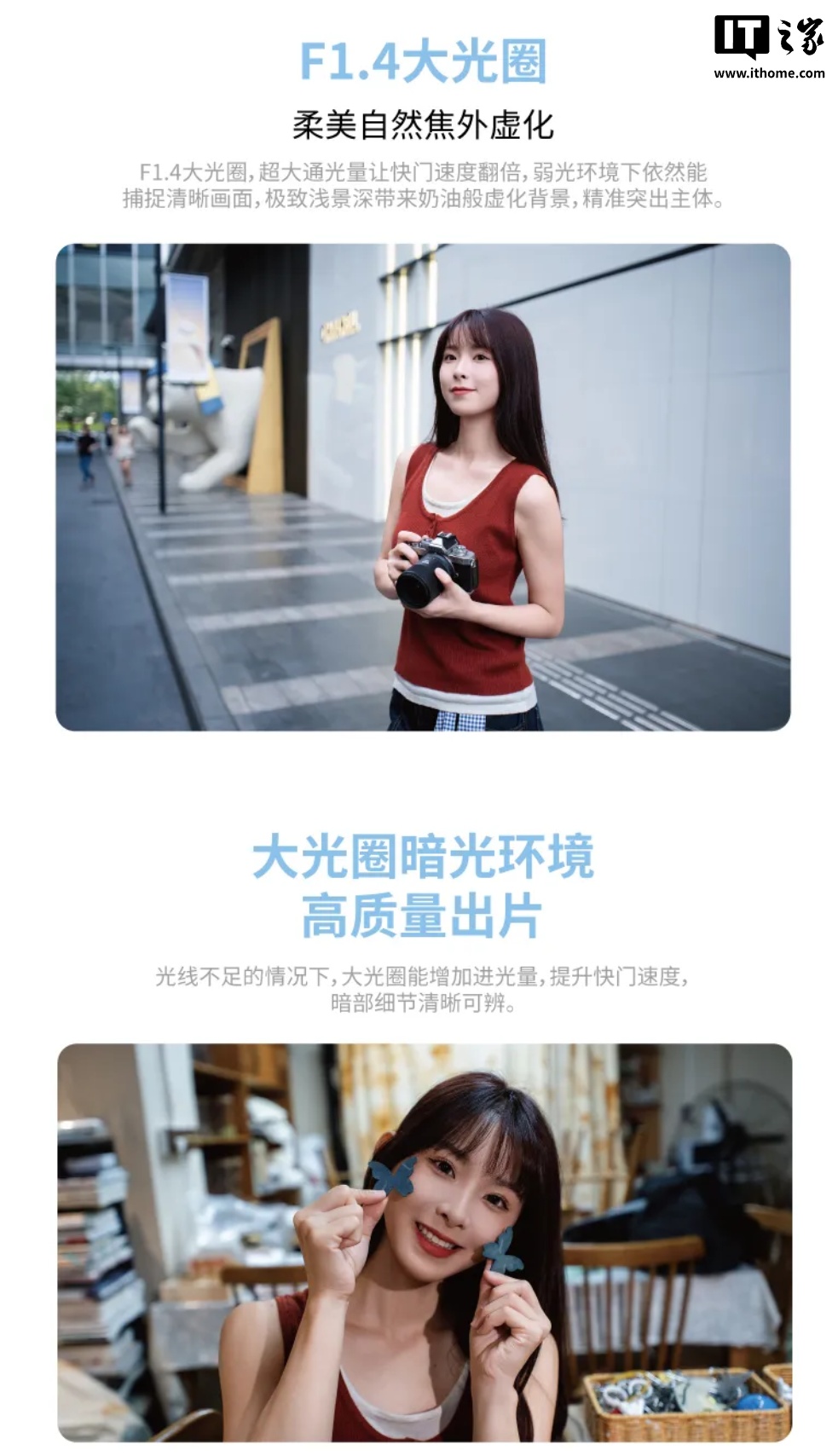 据介绍,这款镜头配备 11 组 13 片光学结构,最大光圈 f/1.4,最小光圈 f/16,可在夜晚等光线不足的场合提供更多光线,降低 ISO、快门,拍出噪点更少的照片,23mm 的焦距经 APS-C 画幅 1.5 倍换算后约等于 35mm,这个焦段一般被摄友们称作“人文之眼”,适合人像、风景、街拍等摄影题材。