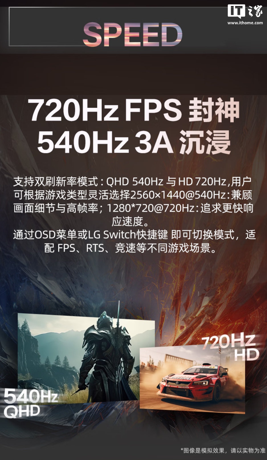 12 月 16 日消息,LG 27GX790B 26.5 英寸显示器现已开启预售,主打硬核 FPS 玩家,采用 2K 540Hz / HD 720Hz 双模设计,配备四层堆叠 OLED 面板,到手价 7999 元。