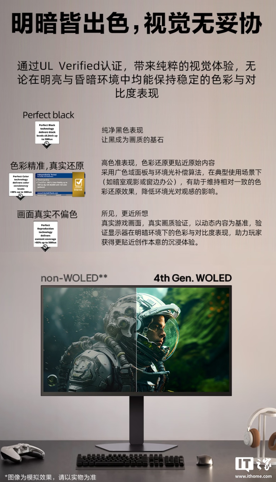 据介绍,这款显示器搭载第四代 OLED 面板,采用创新 Primary RGB Tandem 技术,峰值亮度可达 1500 尼特,可在明亮场景中呈现更多画面细节,通过 HDR500 认证,相比传统 OLED 面板功耗更低,DCI-P3 色域可达 99.5%,ΔE≤2,对比度可达 1500000:1,GTG 响应时间低至 0.02 毫秒。