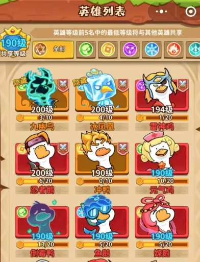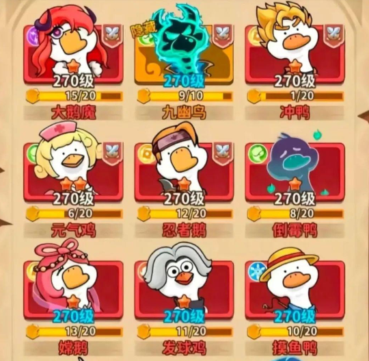 核心英雄:太阳鸟(直接伤害)、机器鹅(持续输出)、战鼓鸡(攻击增益)