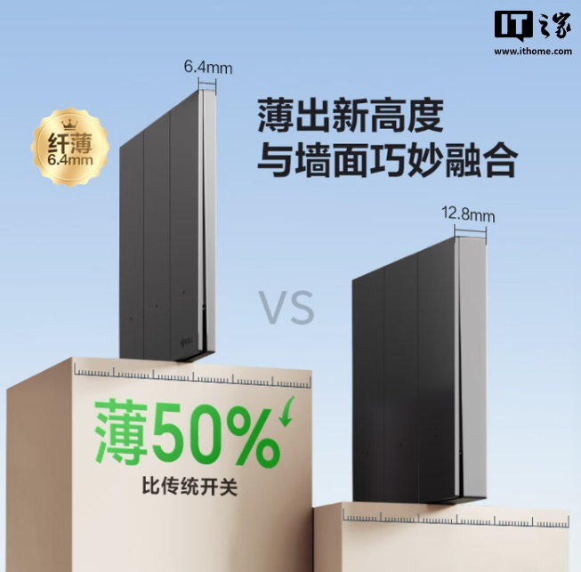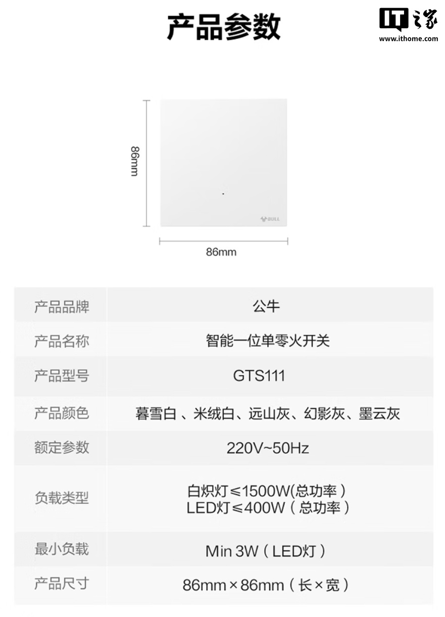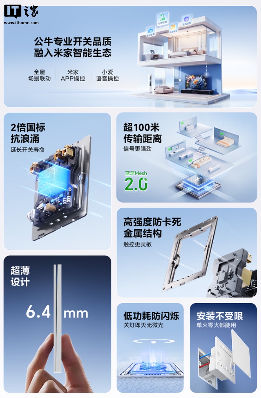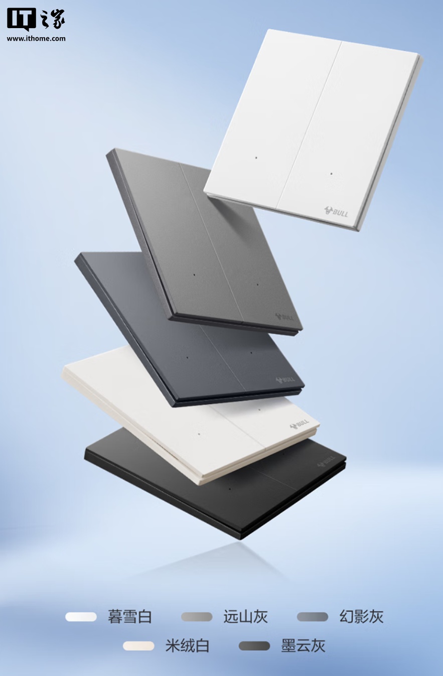 公牛灵犀智能开关支持米家 App 远程控制、小爱语音控制;厚度 6.4mm,采用钢材固定架,可选五种配色。