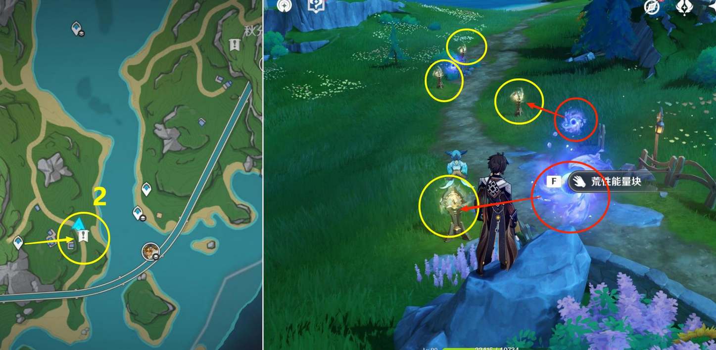 2、第一处解密在【秋风山西侧】,拾取附近3个小水球放在装置中激活大水圈,然后带着水圈去激活剩下的2个水元素机关完成解密获得宝箱。