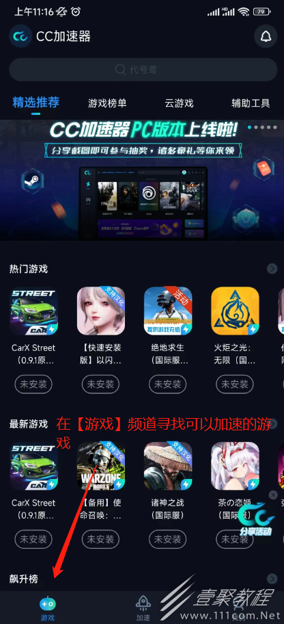 3、在【游戏频道】查看可以加速的游戏,如果不支持那是无法进行加速的;