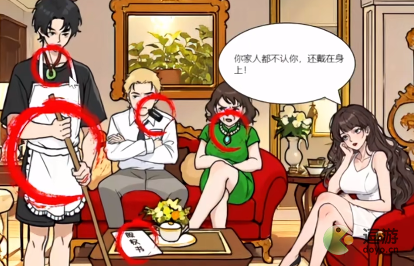 2、然后点击股权书、项链、围裙,上滑小舅子口袋找到车钥匙,上滑小帅衣领找到玉佩