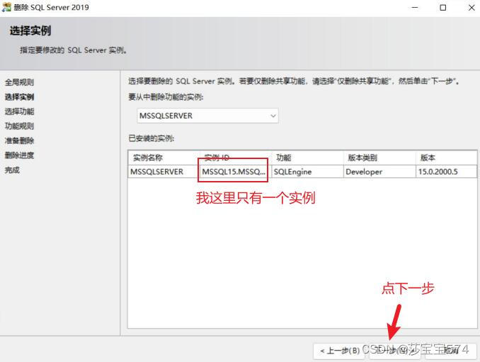 (2)此处需要特别注意,到了”选择实例”这一项的时候,实例ID有多少个,就要删除多少次,也就是说如果实例ID有两个的话,那么这一轮删除完后,再回到MicrosoftSQLServer2019(64位)这里再卸载一遍。然后点击下一步。