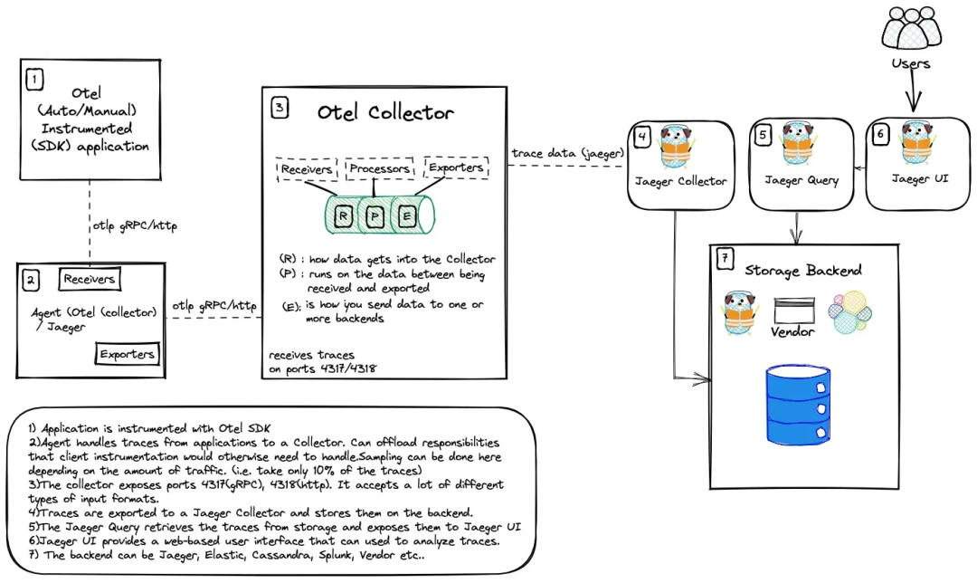 检测我们的应用程序。收集和处理数据。存储和可视化数据,以便我们可以查询它。为此我们可以使用两个开源项目:OpenTelemetry和Jaeger。