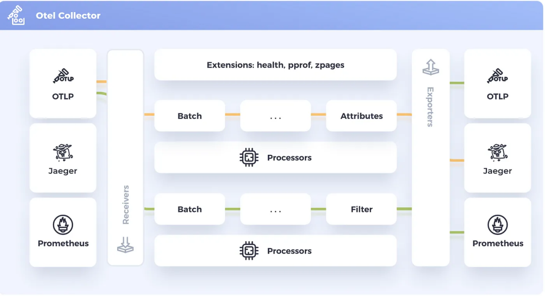 一旦接收到数据,收集器就可以处理数据。处理器在接收和导出之间处理数据。处理器是可选的,但有些是推荐的。