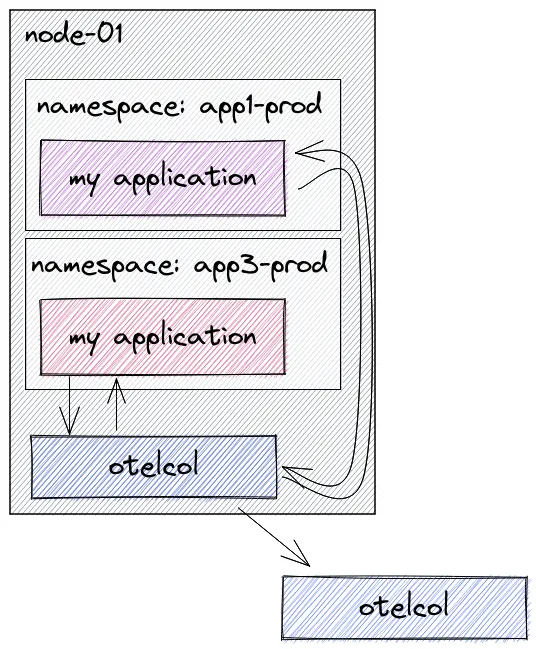 然后我们将使用 Sidecar 模式部署 OpenTelemetry 代理。该代理会将应用程序的追踪发送到我们的中心(网关)OpenTelemetry 收集器。