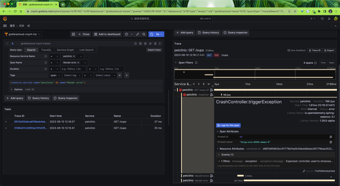 所以在 Grafana Tempo 中也可以看到对应的追踪数据: