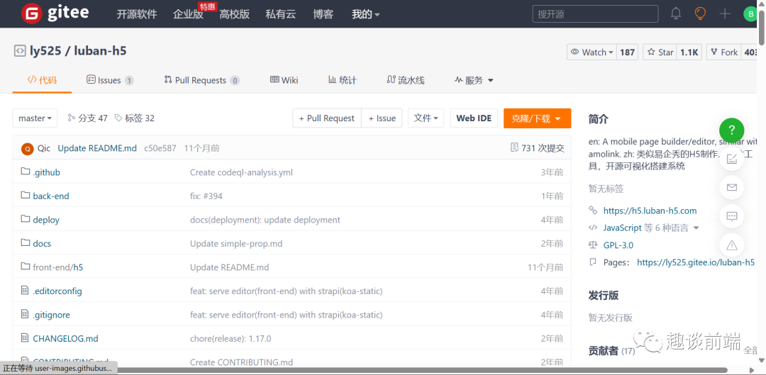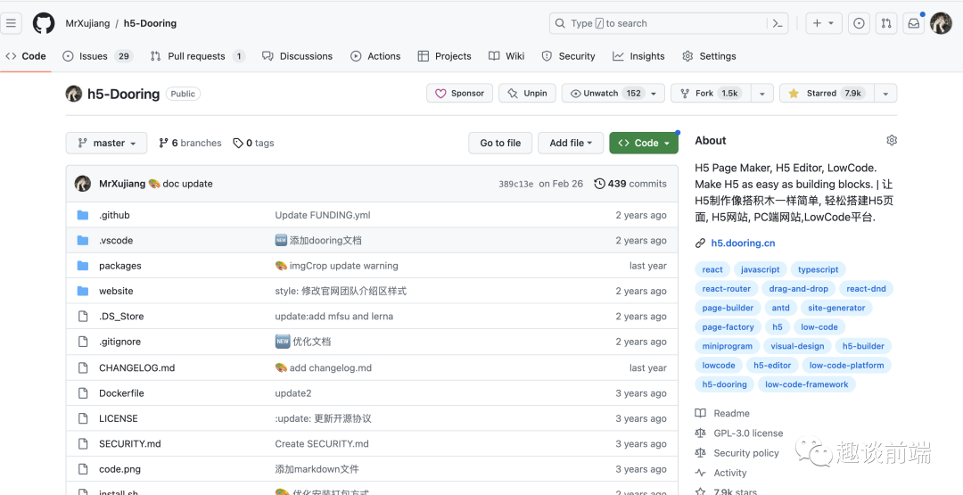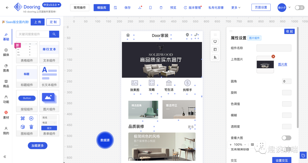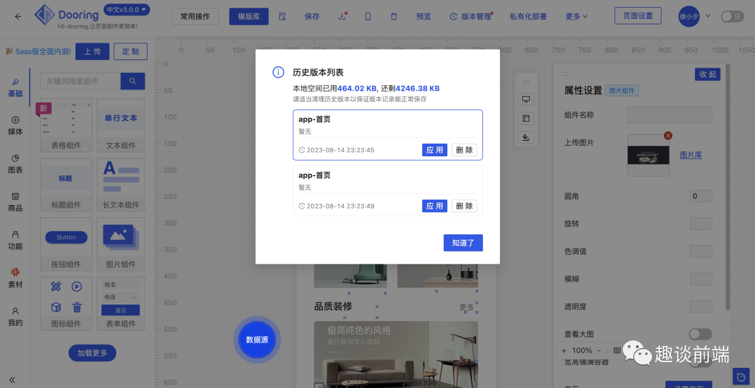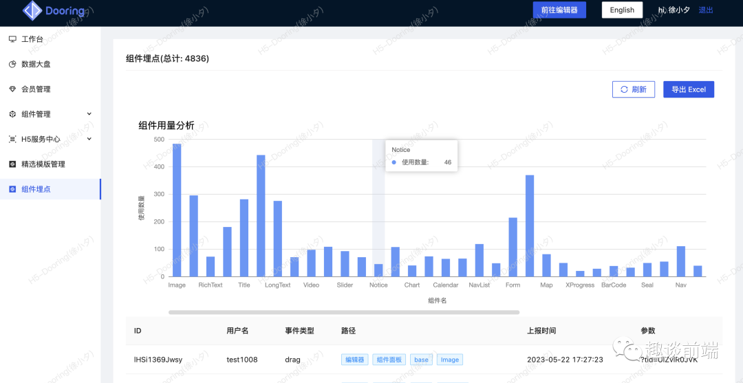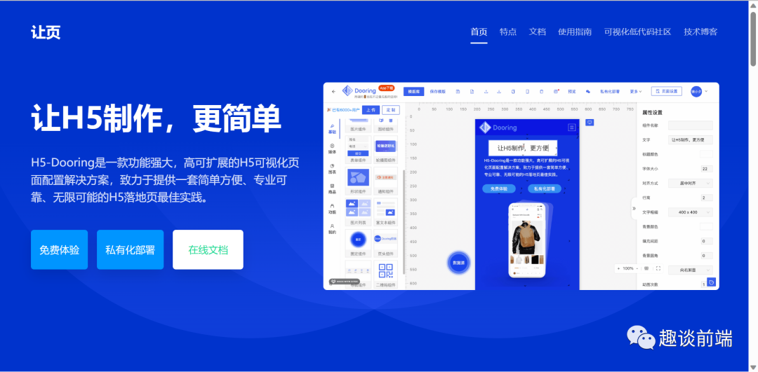 可按团队管理页面 类似gitlab管理项目。合理的权限管理。表单数据收集,并有数据同居。支持页面的pv uv以及自定义埋点信息。方便的资源和组件管理。二、H5-Dooring