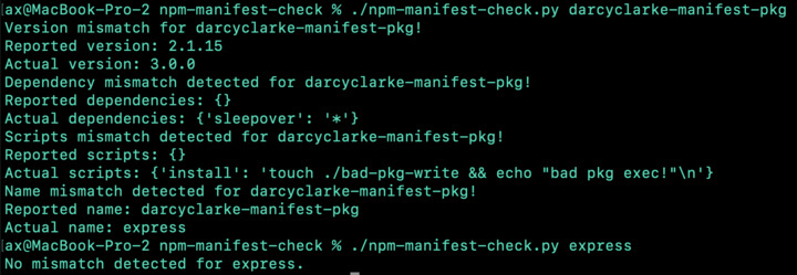 $ ./npm-manifest-check.py darcyclarke-manifest-pkg