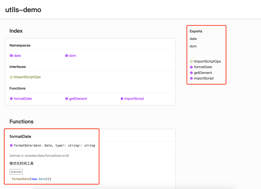 typedoc(TypeScript 项目的文档生成器)能完美支持 typescript 开发工具库的文档生成器的支持,它的核心原理就是读取源代码,根据工具的注释、ts的类型规范等,自动生成文档页面