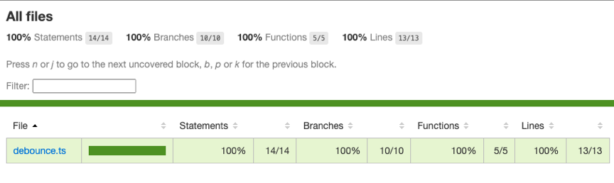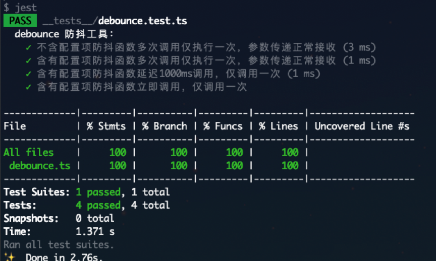 jest 也提供了测试单个文件的方法,这样 jest 只会对防抖函数进行测试(前提全局安装了 jest)。