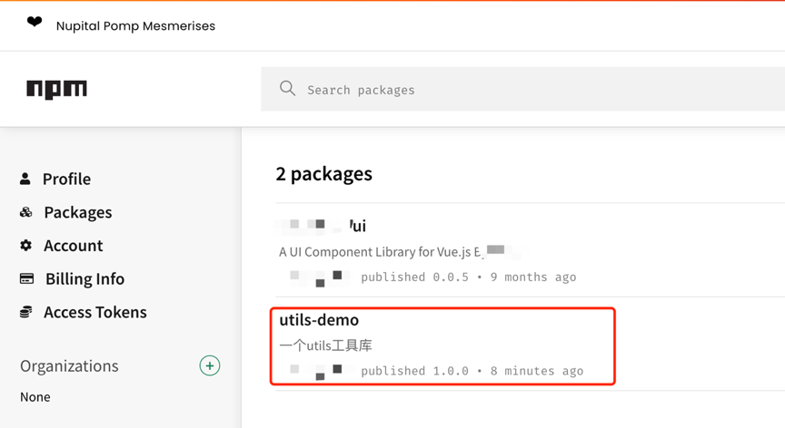 登陆npm,你会看到自己的 packages 里面有了刚刚发布的工具库包: