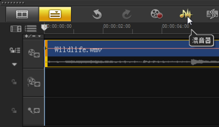 二、单击时间轴视图上方的“混音器”按钮,切换至“混音器视图”。弹出“选项”面板,切换至“属性”选项卡。