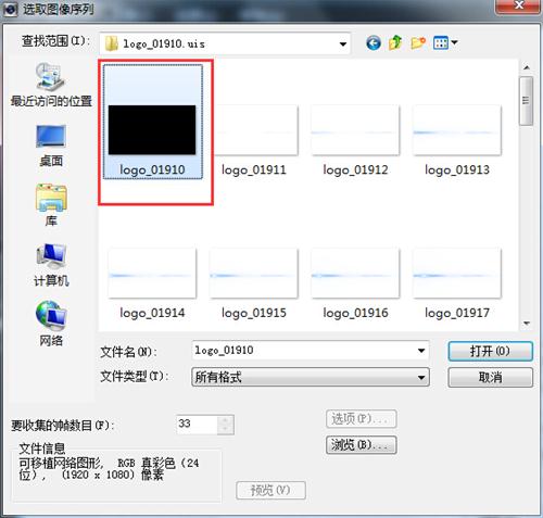 4、在弹出的对话框中点击“选取”,选择序列图的位置,选择第一张图片,点击打开,如图7所示。