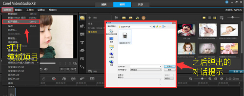 如图2所示,首先 点击“文件”,在弹出的下拉框中点击“打开项目”,然后根据提示导入模板项目;如果没有喜欢的模板,可以试试点击<<会声会影模板下载
