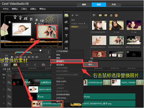 替换模板素材的操作:在打开的模板项目中,选择照片素材,右击鼠标选择“替换素材-照片”,然后按照提示选择照片就可以了,如果遇到视频素材,只要选择“替换素材-视频”,然后按照提示选择视频即可,相同的案例可以参考:怎样快速替换模板教程