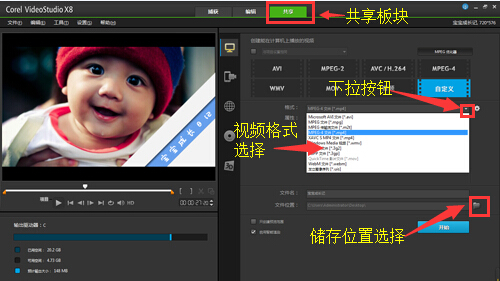 替换全部完成后,点击界面最上部的“共享”,然后选择“自定义”,然后点击格式下拉按钮,选择需要的格式,点击文件位置后的图标,选择文件保存的位置,点击确定,等待渲染完成即可