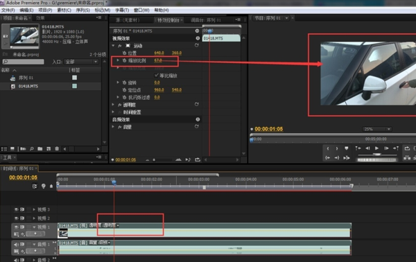 4、如果原素材是1080P的话,导入到720尺寸的源文件中,一定要记得先缩小画面,使其匹配屏幕。