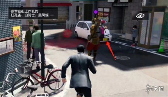 3、我们接取任务后,地图上会出现紫色的菱形符号标志,前往对应街道很容易就能发现金色武者。
