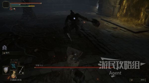 3、扳动雕像前的拉杆,BOSS房门就开了。击败守墓斗士得到战锤(1.02)或骨灰“失乡骑士”英格威尔(1.03)。