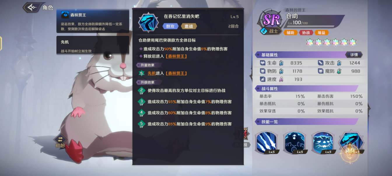 在吾记忆里消失吧为仓助的终极技能,释放后对敌方全体造成攻击力20%附加生命值20%的物理伤害,并且进入【森林贤王】。后续升级就是增加伤害,减少冷却,个人建议优先升级这个技能,这样可以释放先机提前进入森林贤王姿态。