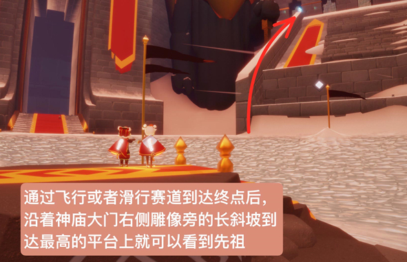 1、我们来到霞谷然后飞到霞光城的领奖台上,神庙的右侧我们就可以看到鞠躬先祖。
