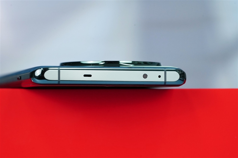 一加12手机顶部配有独立的扬声器开孔和红外遥控,最右侧是一枚降噪麦克风,底部的扬声器与顶部组成立体声场,向右依次是Type-C充电接口、麦克风以及SIM卡槽。
