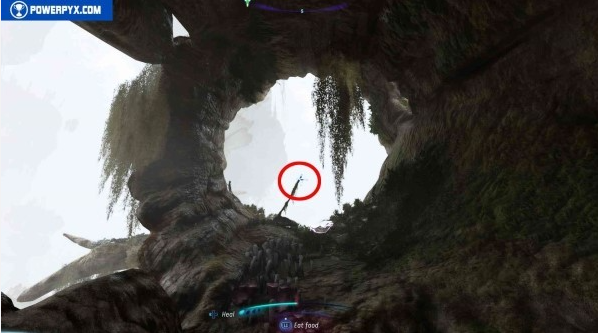 在一棵巨大的树干里,需要从上方进入树干,可以在树干内的一根棍子上看到。