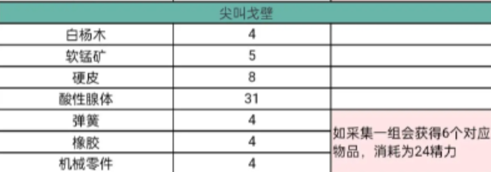2、尖叫戈壁采集物品与消耗精力对应表。此外弹簧、橡胶、机械零件采集一组会获得6个对应物品,消耗为24精力。