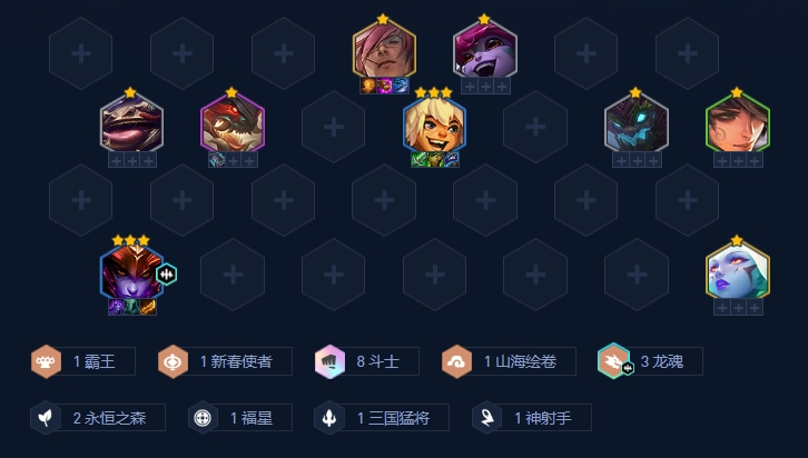 羁绊构成:龙女作为龙魂天选,搭配8斗士和3龙魂的羁绊,构成了这套阵容的核心。